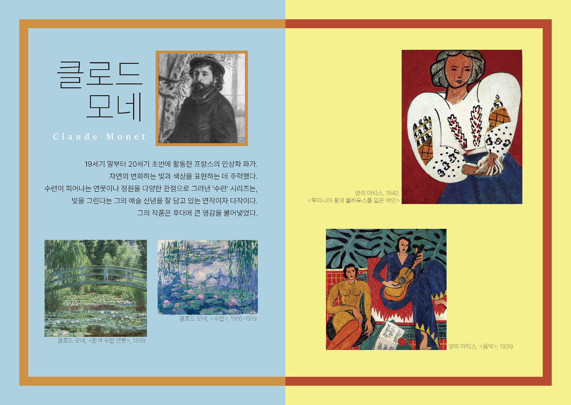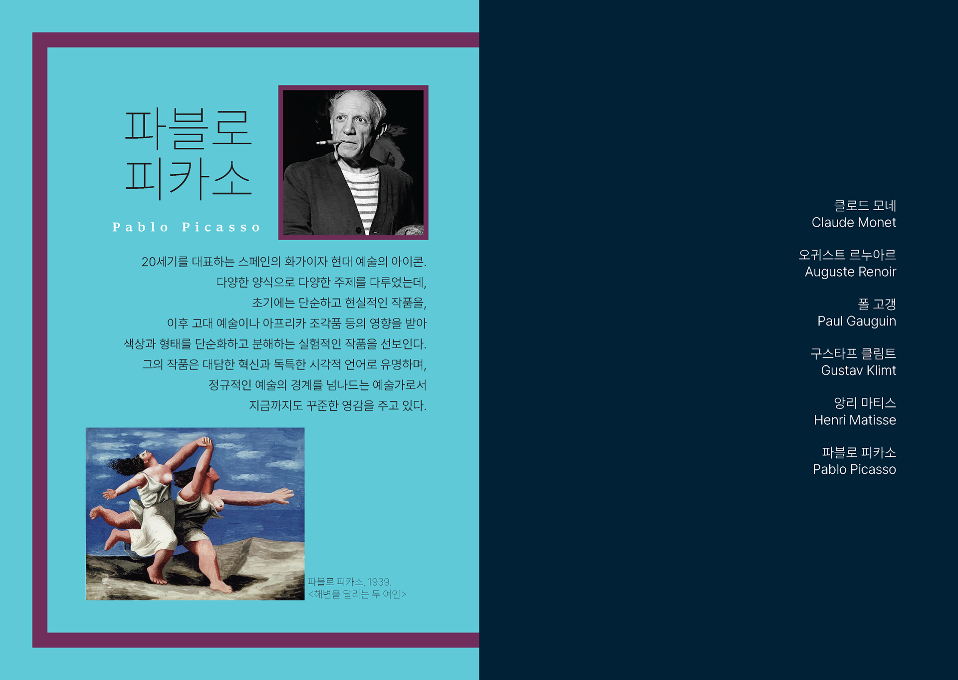 Created a small-format art book featuring research on selected painters and their representative works. Each section uses a distinct color palette inspired by the artist’s style. While the book contains concise information, emphasis was placed on visual harmony and color-driven design.